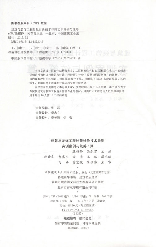 本書是通過一層砌體結構收發室、二層框架住宅和13層框剪住宅三個案例來詳細講授如何進行建筑與裝飾工程計量、計價(編制招標控制價)的教材。它與國內現有教材的區別是:用電算來替代手算;用圖算( BIM)來驗證統籌e算的 結果;并給出全工程詳細計算式和完整計價結果。本書要求學生用筆記本電腦上課,授課時間不低于240學時。本書可作為大專院校建筑與裝飾工程造價管理專業的教材;可供廣大工程造價人員學習和參考,用于解決10人算10個樣的難題。
